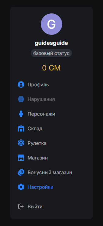 Личный кабинет включает несколько основных разделов: профиль, игровые персонажи, склад, рулетку, магазин, бонусный магазин и настройки.