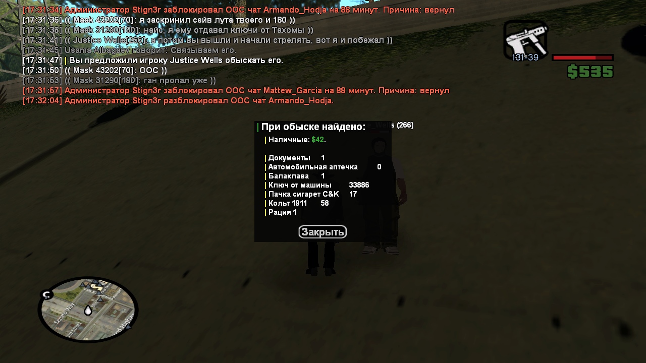 3. Суть жалобы: Крч чел подбежал к своему другу начал что то выяснять потом когда все отбежали кроме меня он передал ему что-то так как чела добили во 2 у него не мог оставаться кольт в инвентаре значит что его кто-то передал после смерти, я сделал оос обыск на всякий случай и у него в инве был кольт который ему передал 180 ид сказав что "кольт уже пропал давно" когда мы уже сидели в лесу он сказал что у него есть кольт, и что он у его друга на скринах выделено