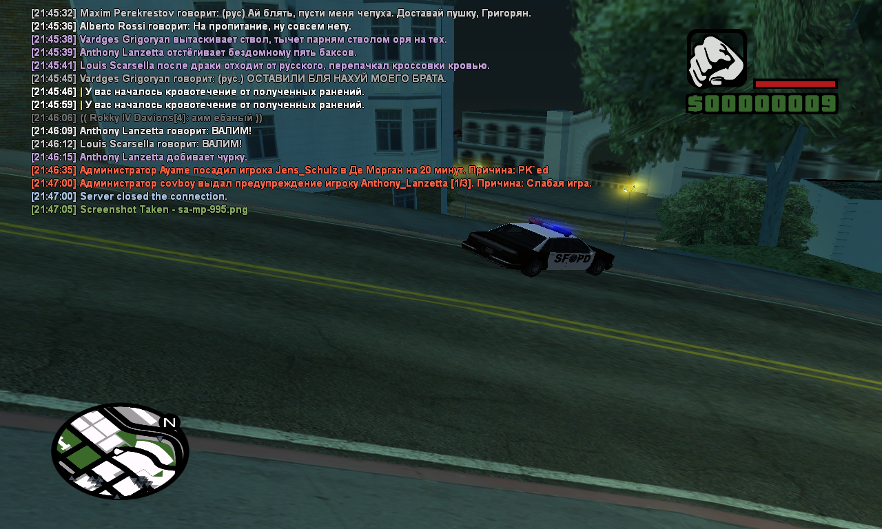 Вот нахуй по чату посмотри что мы хуярить по чуркам начали не просто так - так как один завязал перестрелку и была экстренная сита. И внепланово приехали копы от чего мне с соигроками пришлось перестрелять их и убежать пешим, так как тачка у меня была в заднице. От чего обиженные копы в ТС передали что мы их мочканули и куда убежали и был как раз патрульный с мигалками который нас преследовал по оос инфе и так как экстренная ситуация до сих пор шла мы его мочить начали.