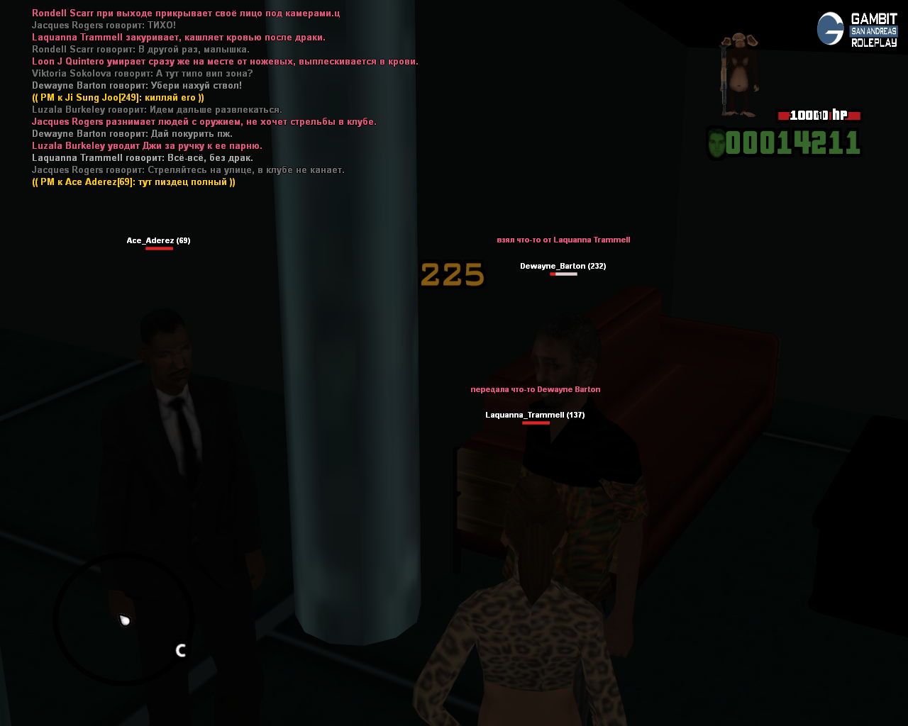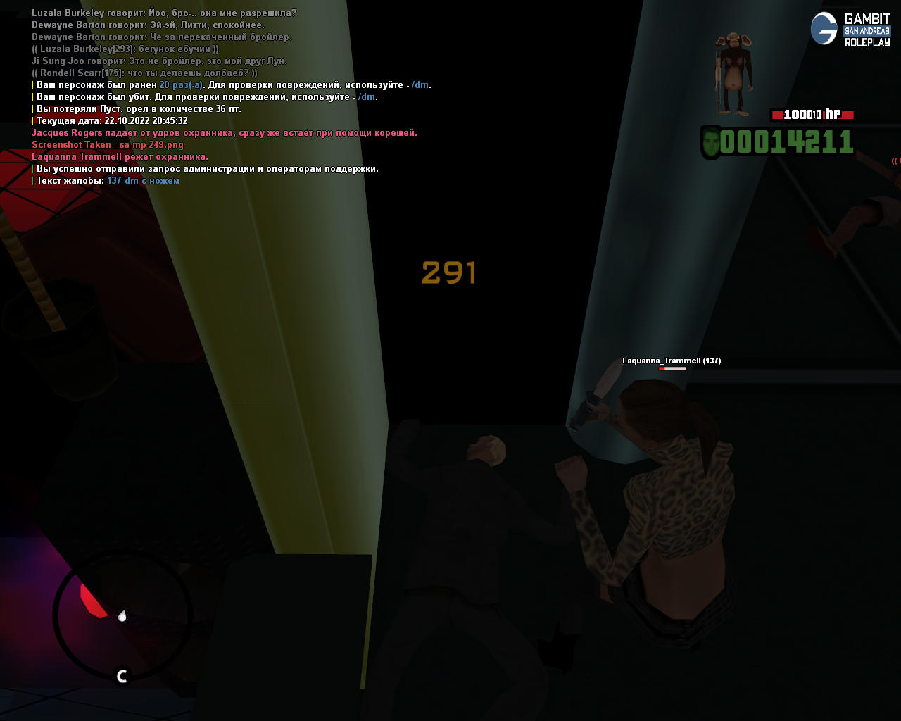3. Суть жалобы: Короче, играю охранника в клубе, потушил буянщиков, после чего подлетает чувак с ножем, будучи сука в ОБЩЕСТВЕННОМ МЕСТЕ (ЗЕЛЕНОЙ ЗОНЕ) начинает меня резать при всех, и на похуях скидывает ножик со своим дружком, и уходит умышленно из клуба.