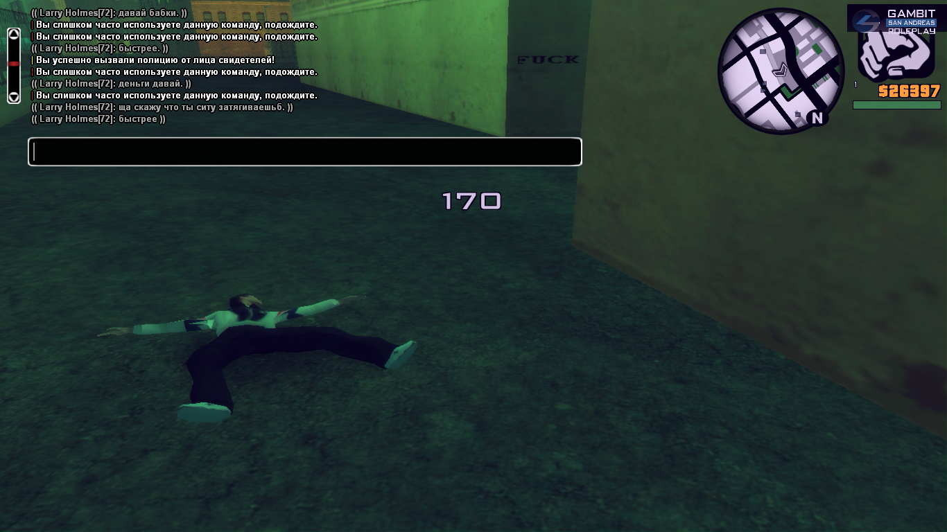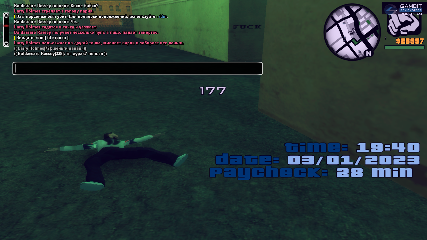 Ладно, но что было потом. Возвращается он через пару минут, походу вспомнил про бабки. Начинает грабить, я ему объяснить пытаюсь, что эт лутерство, а я мертвый. Он мне затирать начинает про затягивание ситы. Да и админ странно себя повел, на пару секунд появился и ушел.