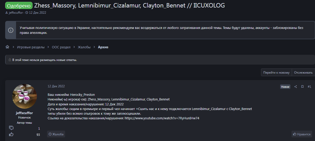 Единственное что хочу попросить дальше в жалобе это хотя бы сделать бан на время или вовсе рассмотреть ВСЮ ситуацию с самого начала и дать вердикт.