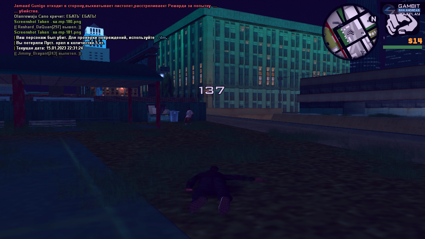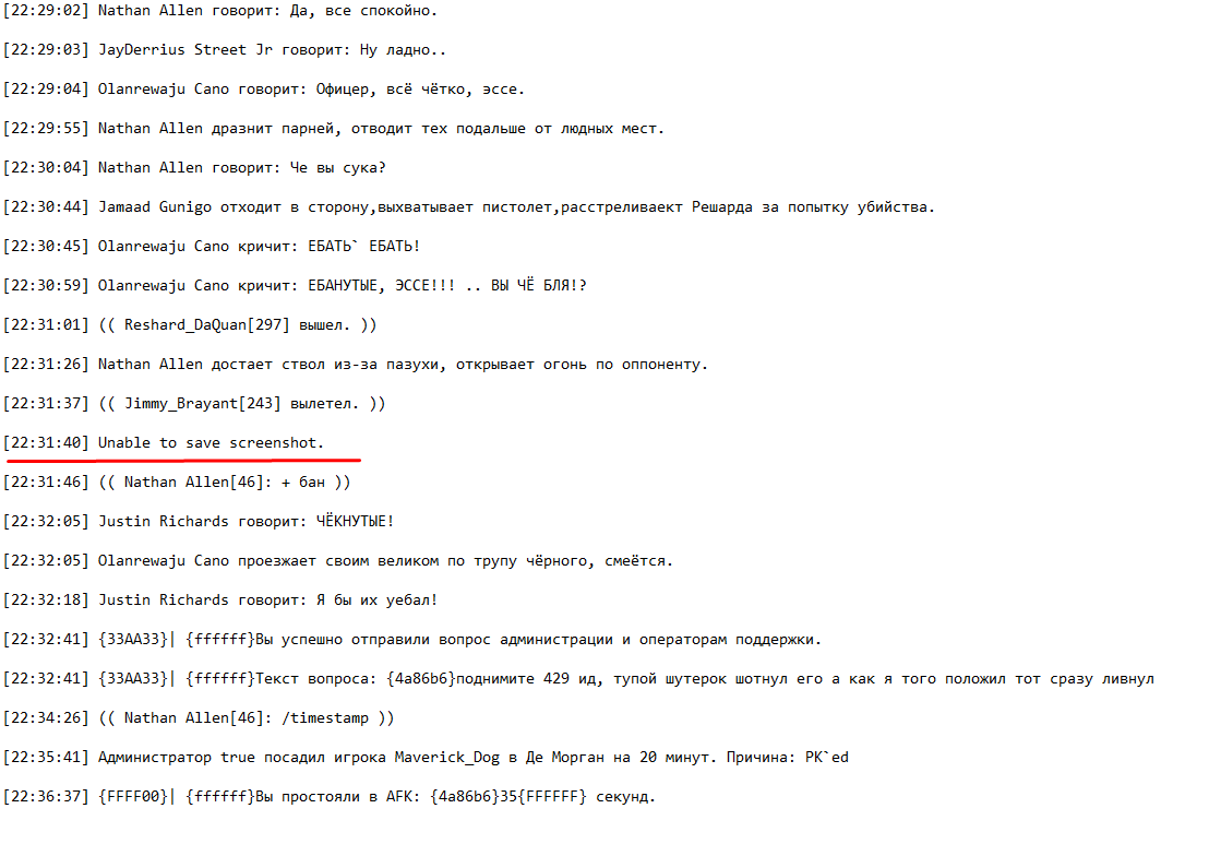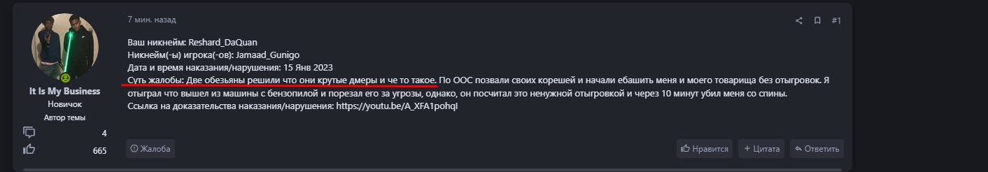 Суть жалобы: Две обезьяны решили что они крутые дмеры и че то такое. По ООС позвали своих корешей и начали ебашить меня и моего товарища без отыгровок. Я отыграл что вышел из машины с бензопилой и порезал его за угрозы, однако, он посчитал это ненужной отыгровкой и через 10 минут убил меня со спины.