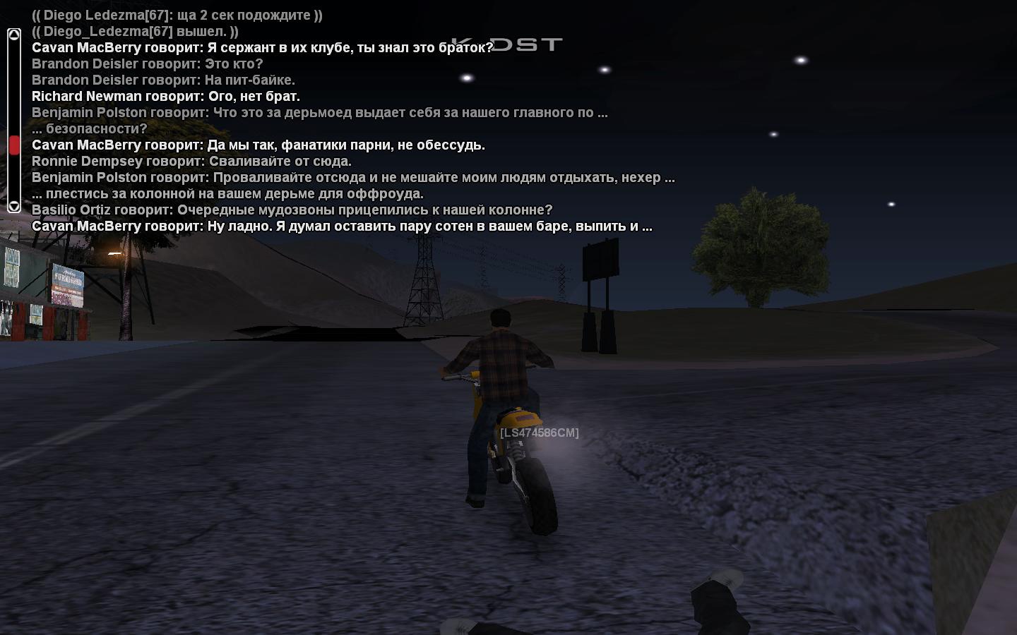 Паркуетесь, начинается общение типа "я их сержант", откуда ты вообще это берешь, высираешь - не ясно. Конечно же ты не напишешь, что тебя просят несколько раз уехать, так как вы уже наложили под себя и персонажам вы не интересны - вы продолжаете стоять, вам уже прямо говорят что вам так сказать /конец/. Вы вместо этого, чтобы молча уехать, что предпринимаете? Правильно, называете крупный на территории Карсона клуб, который недавно участвовал в /войне/ с другим гей тусовкой. Сделал это твой друг - прилетело в тебя.