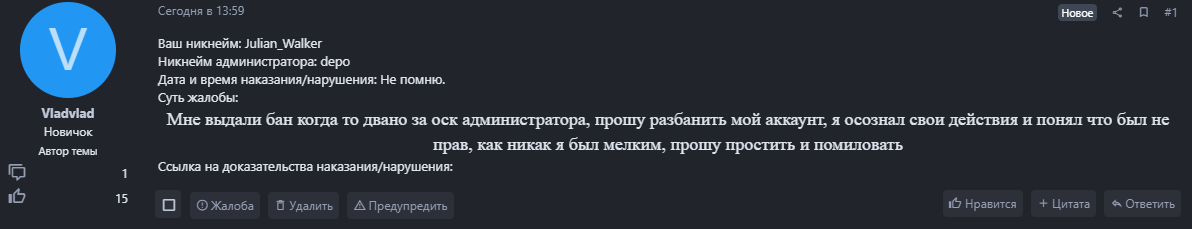 Мне выдали бан когда то двано за оск администратора, прошу разбанить мой аккаунт, я осознал свои действия и понял что был не прав, как никак я был мелким, прошу простить и помиловать