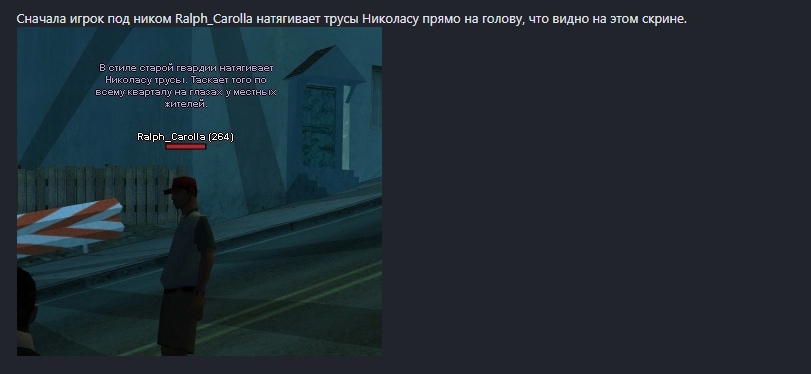 Сначала игрок под ником Ralph_Carolla натягивает трусы Николасу прямо на голову, что видно на этом скрине.