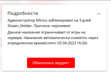 Суть жалобы: забанил за неролевое, опирась на том, что я писал всякие пакости в стадии, вместо отыгрыша, но вот возникает справедливый вопрос, нахуя собственно отыгрывать безоправданный, фановый шот от игрока, который к тому же поплатился и улетел бан?)