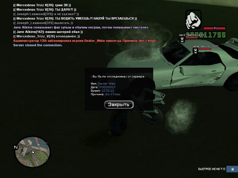 Суть жалобы: Прошу забанить данного персонажа за его неадекватные действия, которые спровоцировали меня достать оружие без отыгровки.