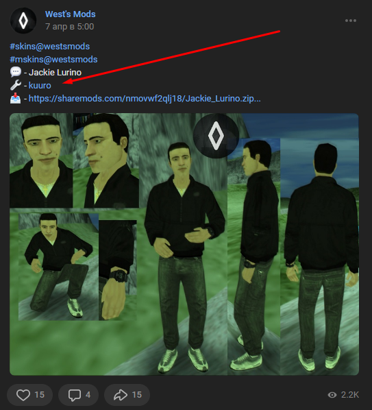 Переходим на креды, и смотрим уже в этой группе скины. Обычно группы делают упор на определённом типе скина, негры, лато, байкеры и т.д, поэтому ищем в WEST MODS и song's mods более менее похожие скины на то что вам надо, переходите на креды, и ищите уже там.