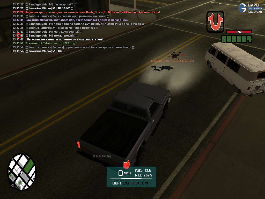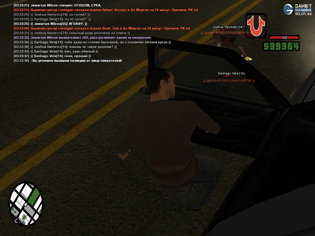 Суть жалобы: Данный опарыш, заебашил меня с дроби за нихуя, он даже не отыграл как достал ее, откуда достал его отыгровка "/me убивает Джошуа за покушение" К тому же носит дробь в быстром слоте без аттача, это уже нрп инв и дм. Прошу наказать данного игрока по всей строгости правил.