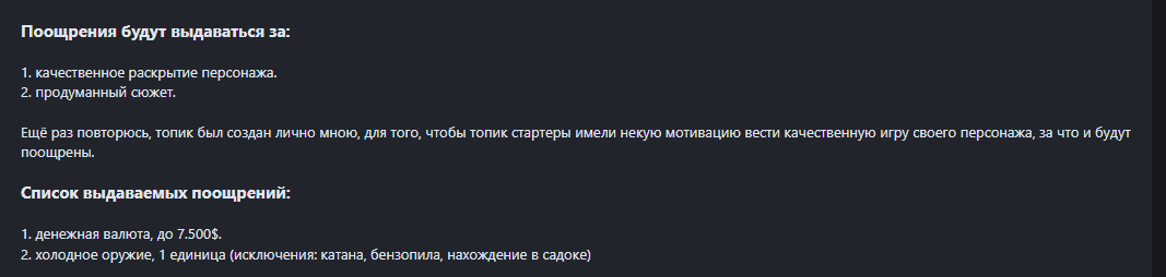 • Привет, Гость! раскройте свой потенциал в разделе игрового мастеринга, создавая уникальные RP-сценарии и атмосферу проекта! Вас ждет карьерный рост, расширенный функционал и поощрения - от оружейных кейсов до Platinum VIP. Станьте архитектором игрового процесса!
