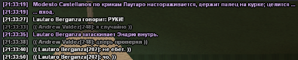 нет брачо, ситуация начинается с того, что твой чибзик увидя кар Эльвиры заходит в инту на похуй, а после моей отыгровки точно так же и выходит. а затем идом ошибся и видимо вам оос инф кидает о нашем состоянии. с проверяющим могу в отдельном порядке более подробно все показать. идем дальше