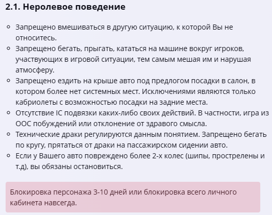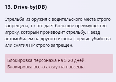 Действительно. Игрок, находясь на крыше автомобиля, без причины избивает и наносит повреждения транспорту, а после просто убегает. Может, здесь и был Drive-By со стороны игрока Killian_Rollack_Sr, но это не значит, что нужно отвечать нарушением на нарушение. А в силу того, что я не могу найти нарушение 13 пункта правил, то я оставлю это без внимания и учту лишь 2.1.