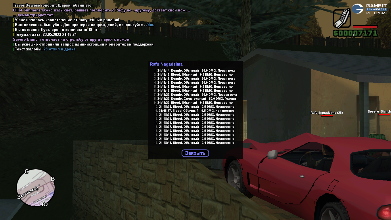 Суть жалобы: Игрок Rafu_Nagadzima приезжает к моему дому и хочет выкупить его мы всячески шутим с него после чего один из моих соигроков захотел его ограбить достав нож в этот же момент человек начинает открывать огонь используя перекаты к сожелению док-в у меня нет нас положили после чего Rafu_Nagadzima сразу же хиляется что можно чекнуть по логам или посмотреть по логам или посмотреть на мой скрин где вы увидите ДМ игрока и его кол-во ХП.