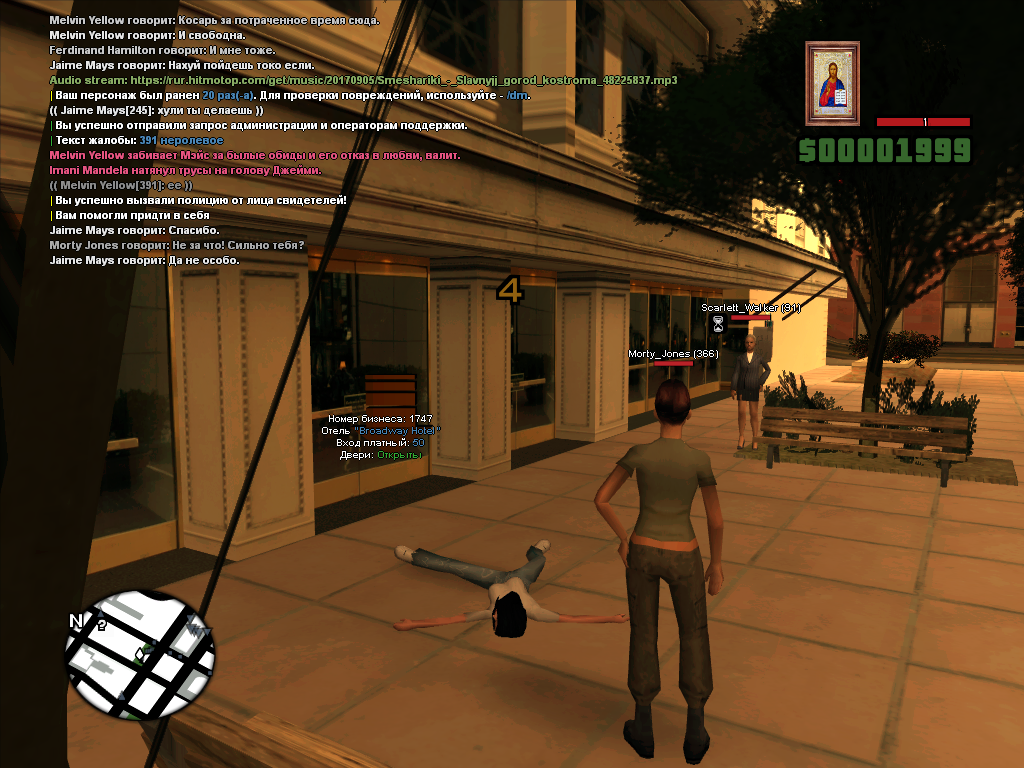 К слову, как утверждает Фердинанд, то я заспавнился у отеля после вылета, хотя минуты 2 даже не прошло, как я зашел. Насколько я знаю, по системе после выхода, если у тебя не стоит спавн дома или стандартный, ты оказываешься там где вышел. Даже если спавн у тебя стоит стандартный у отеля, то должно пройти не меньше 10 минут, прошло не больше 2 минут, на спавне я очутился пешком. При заходе в игру на том месте, где была попытка совершить то ли изнасилование, то ли ограбление, никого не было.