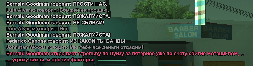 Подъезжаешь ~~> К тебе доебывается Федерико ~~> Ты его оскорбляешь в ответ на сообщение "Съебись, вафля" ~~> Он тебя оскорбил ~~> Ты его давишь, ~~> Я тебя послал нахуй отсюда, ведь ты реально гоняешь по тротуару, гоняешь круги и маешься хуйней ~~> Меня сбиваешь вместе с ним ~~> Ты это провернул около 5-и раз, что доказывает фрапс ~~> моему терпению пизда и я открываю огонь в целях самообороны по тушке твоего латиноамериканца