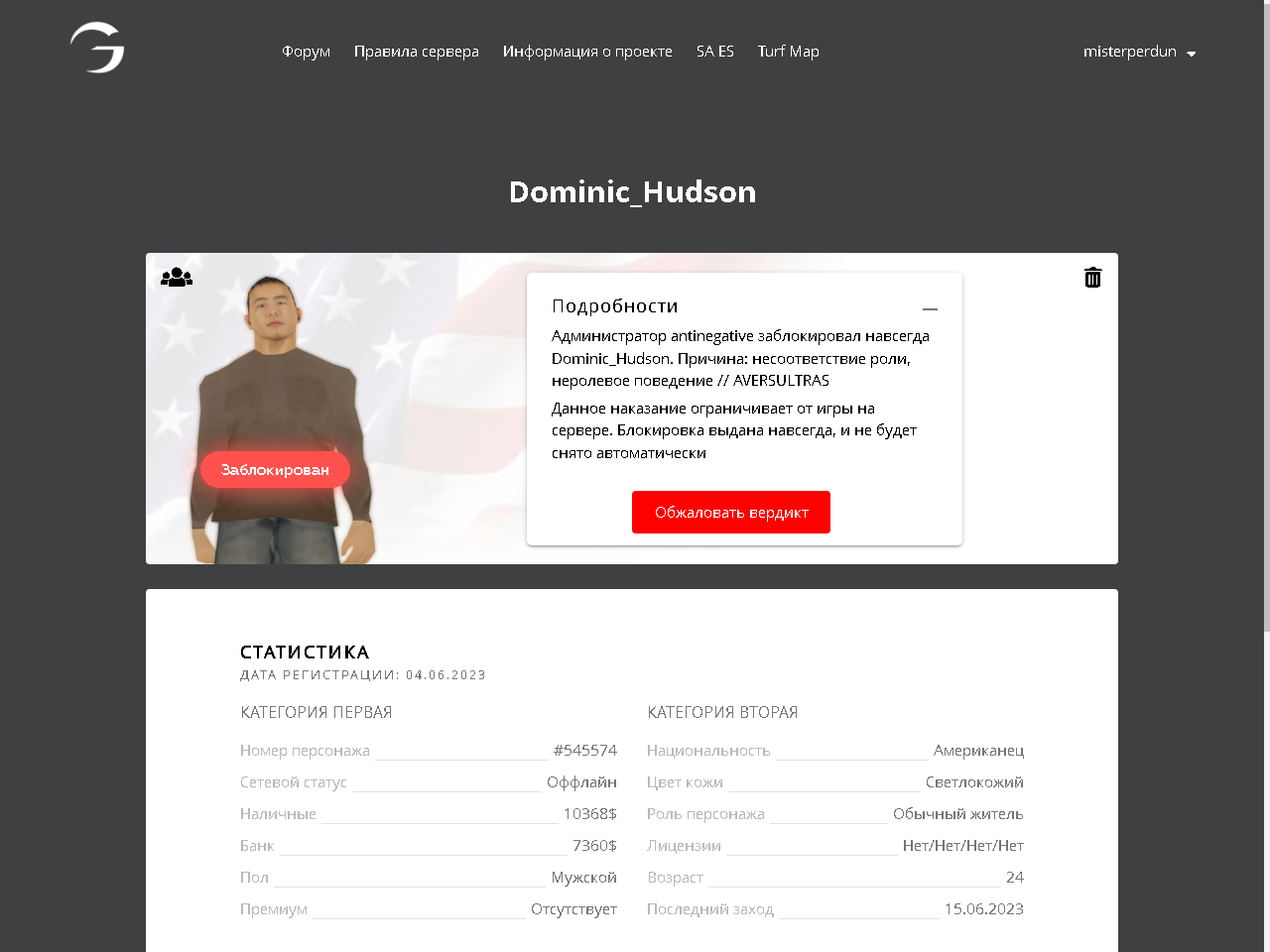 Суть жалобы: где мое несоответствие роли и неролевое поведение,админюк обиделся и забанил моего персонажа навсегда.