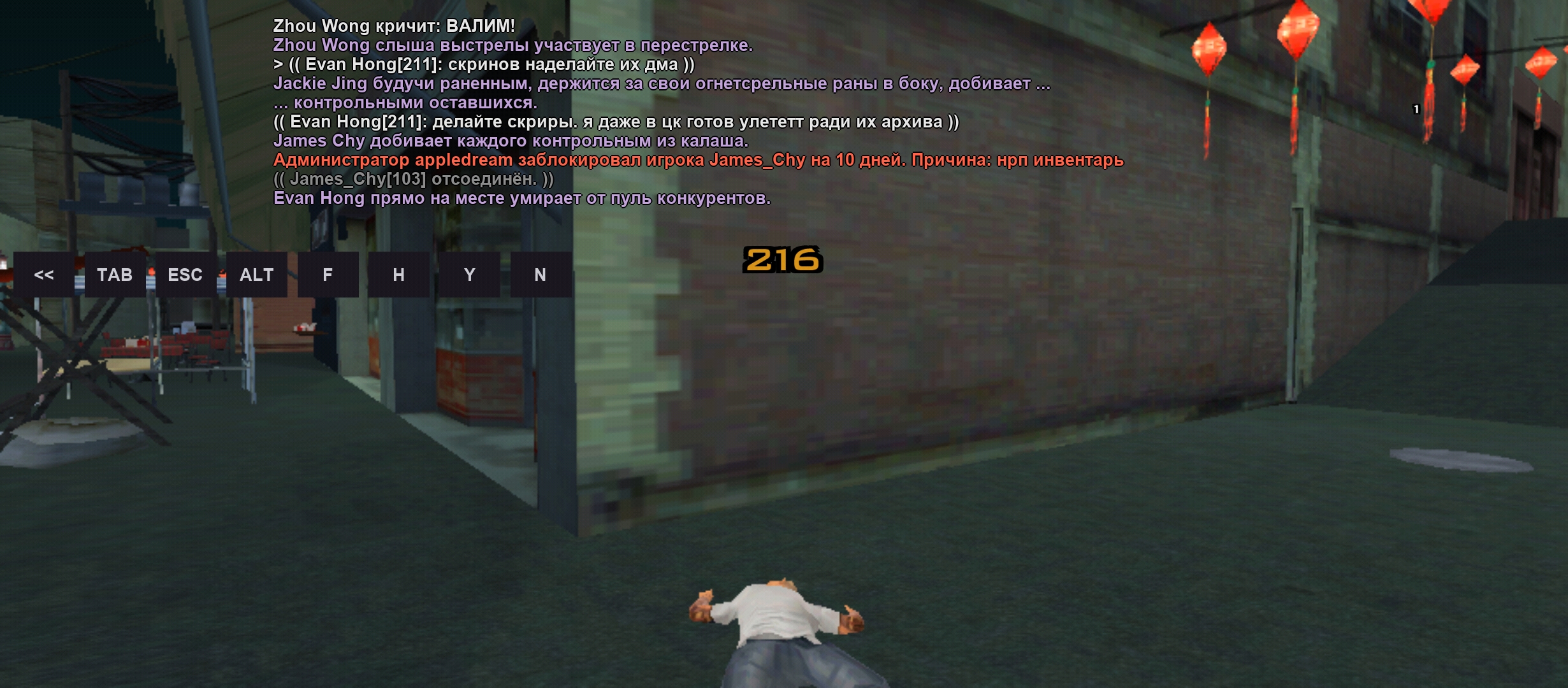 Суть жалобы: у нас начались переговоры за территорию чайнатауна СФ, как я понял это еще и фракция самого эплдрима, не суть. спустя время переговоров было принято решение силой забрать район. начинается стрельба, я достаю автомат калашникова, ПРОШУ ЗАМЕТИТЬ автомат я с собой не носил, мне его передал игрок фракции прямо за минуты две до стрельбы. после того как игроки враждебной фракции были отправлены в стадию я получаю бан за нрп инвентарь. еще администратор по словам моих соигроков сказал что я скроллил калаш. прошу предоставить многоуважаемого эплдрима фрапс всей ситуации. ниже прикладываю скрин как мне был передан калаш, если че еще по логам смотрите.