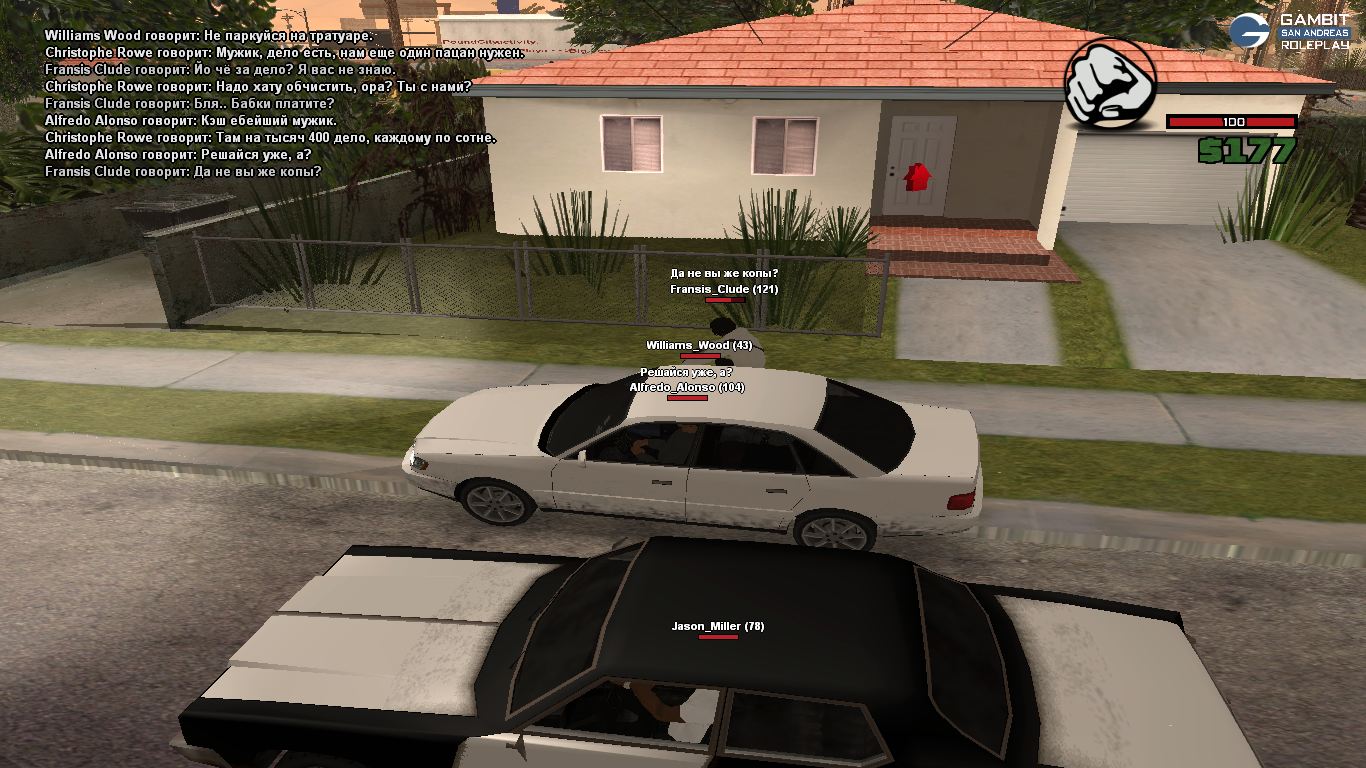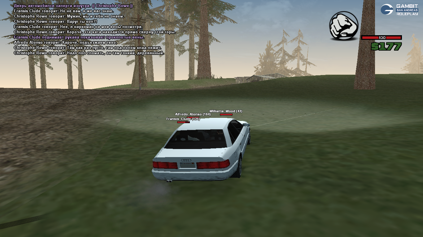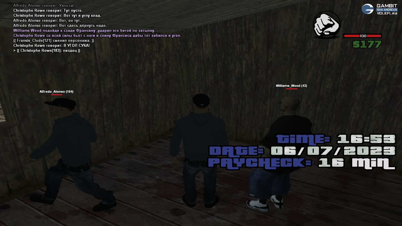 Суть жалобы: Мы играем фракцию расистов, когда мы увезли жертву в лес под предлогом "нам нужен человек что бы помог найти клад" мы зашли с жертвой(Francis_Clude) в дом, отыграли как ударили его битой по голове и пнули ногой чтобы тот забился в угол он просто сменил персонажа, тем самым покинув ситуацию. Скриншоты все укажу в ответах под жалобой.