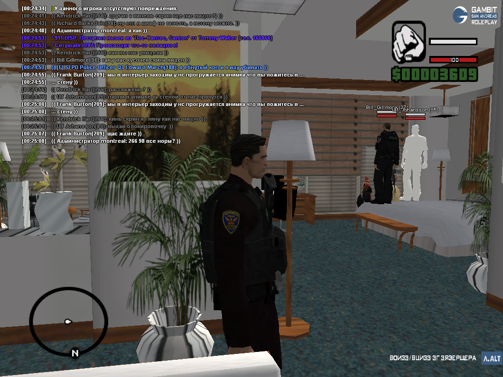 здарова, я Билл Гиллмор, вот скрин тебе, братуха, о том что вы прятались в стене и потом вас забанили, ты конечно же умолчал, как и о том, что ты играешь что ты в "шкафу", когда ты в стенке, но залить жалобу лишь бы до нас доебаться ты не забыл, я понял в целом как ты и твои товарищи играете) я кстати так же играл детектива Кейна Зарора и играл с вами по честному, даже твоего персонажа Роя Спаду со складом ганчиков выпускал чтобы не душить когда вы лкн играли, в следующий раз - окей, по всей строгости с вами пойдем, скрин необрезанный прикладываю ниже, как и скрин моего товарища @damage inc где видно как вы встаёте в анимки в стенку тоже скоро будет.