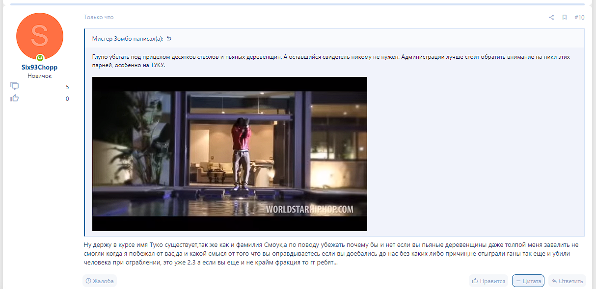 Суть жалобы: Мы катались по Энджел-Пайну с моим другом, затем остановились около парня и мой друг пошел попросить у него денег на бензин, на деле на пиво. После получения денег мы сели в авто но на нас внезапно выбежало около 5-7 селяков с оружием и кричали чтобы мы вышли. Мы вышли, мой друг нашел момент и сумел убежать в лес, а я остался лежать возле них, после чего они с криками вали жирного убили меня с пистолета и скрылись. Считаю произошедшее как минимум нарушения правила 2.3, а как максимум ДМом.