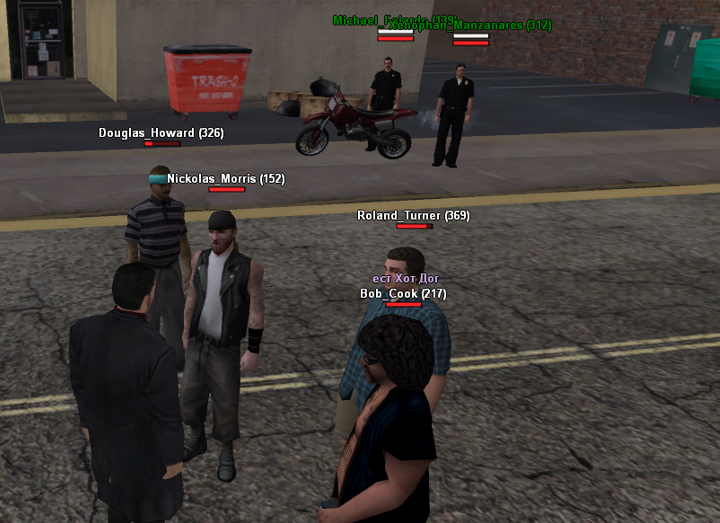 С парнями играли, завязалась драка перед копами, т.к копы знакомыми оказались постояли на месте поглазели пока всё не уляжется и уехали. После драки нас перекидали во вторую. После убийства 4 человек отъехали на минуты 2 и вернулись с долгожданной отыгровкой /me мочиться на труп байкера, бьёт его ногами. После преступления возвращаться обратно чтобы обосцать труп это нужно быть очень смелым игроком, уважение за это.