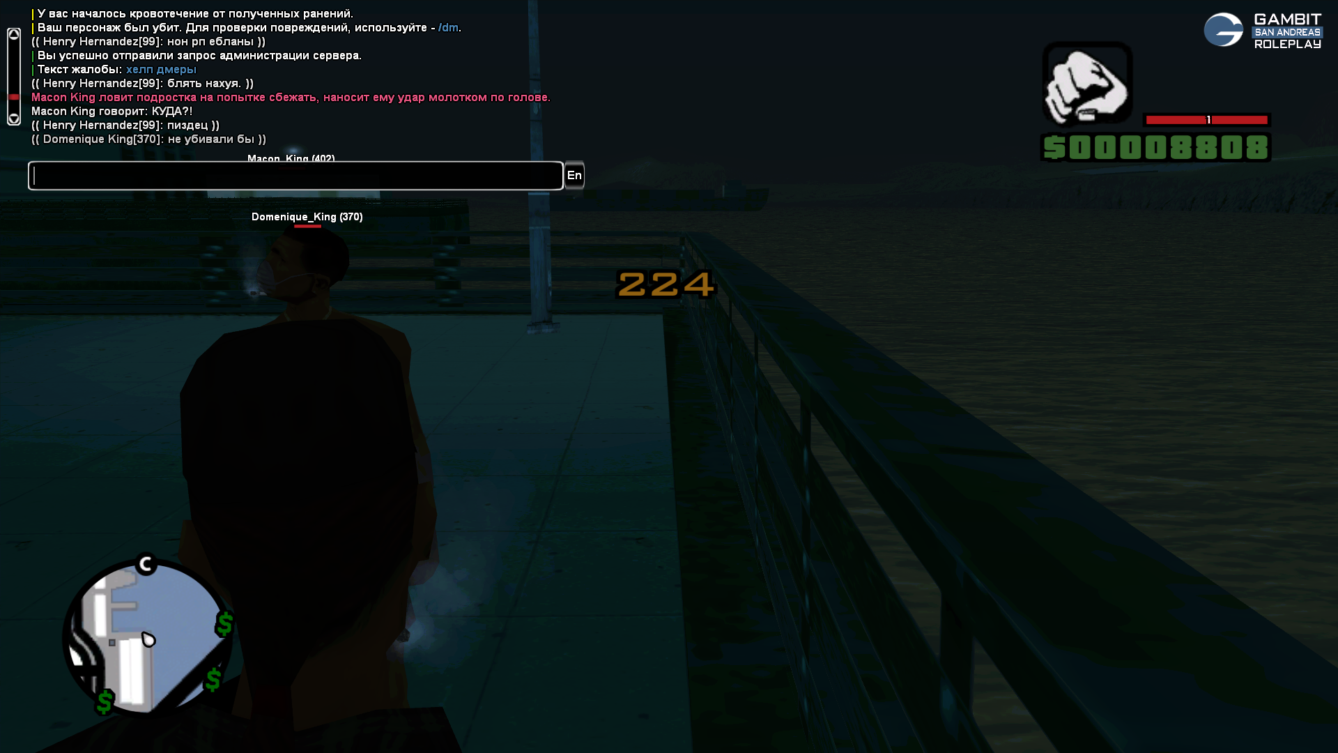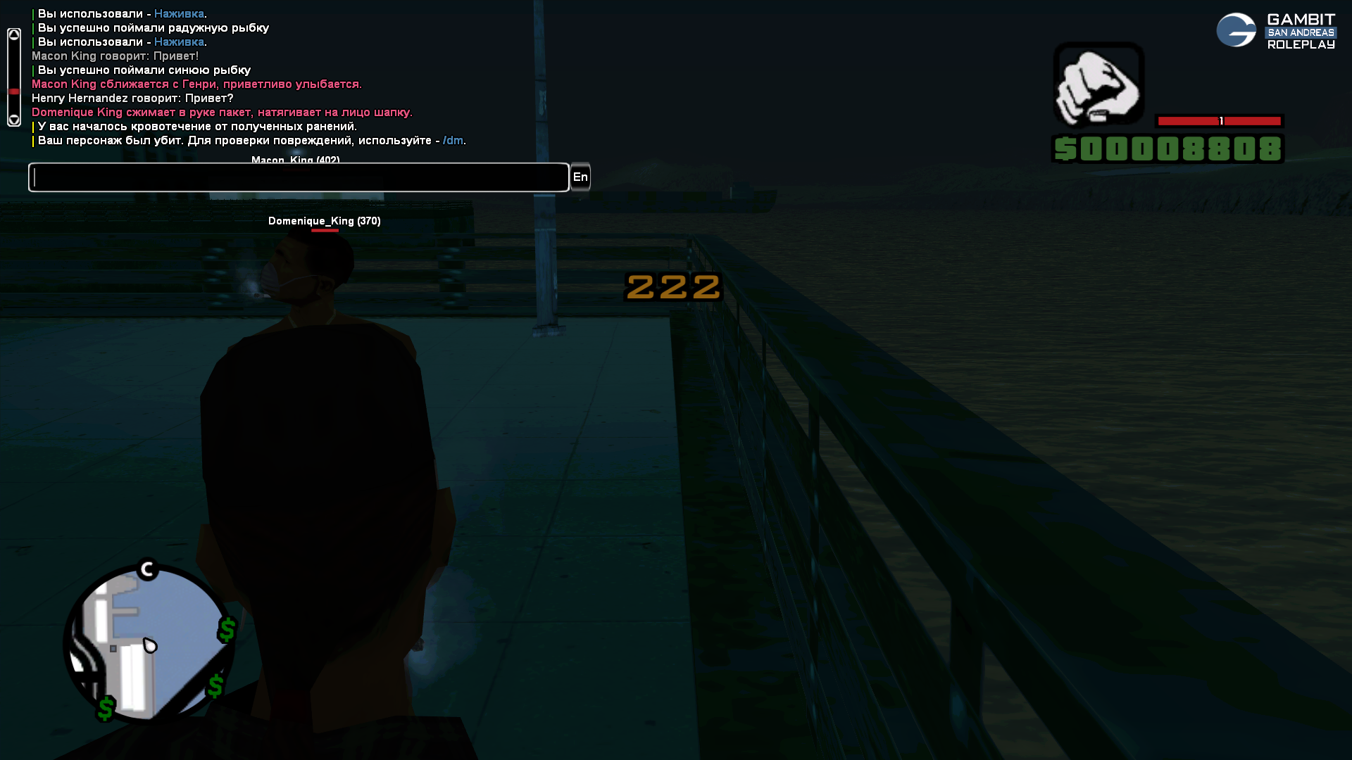 Я рыбачил себе спокойно в СФ. Вдруг сзади ко мне подходят Macon и Domenique. Говорят "Привет". Я понимаю что дело плохо, я резко сажусь на велосипед, меня скидывают и убивают ножом без отыгровок.