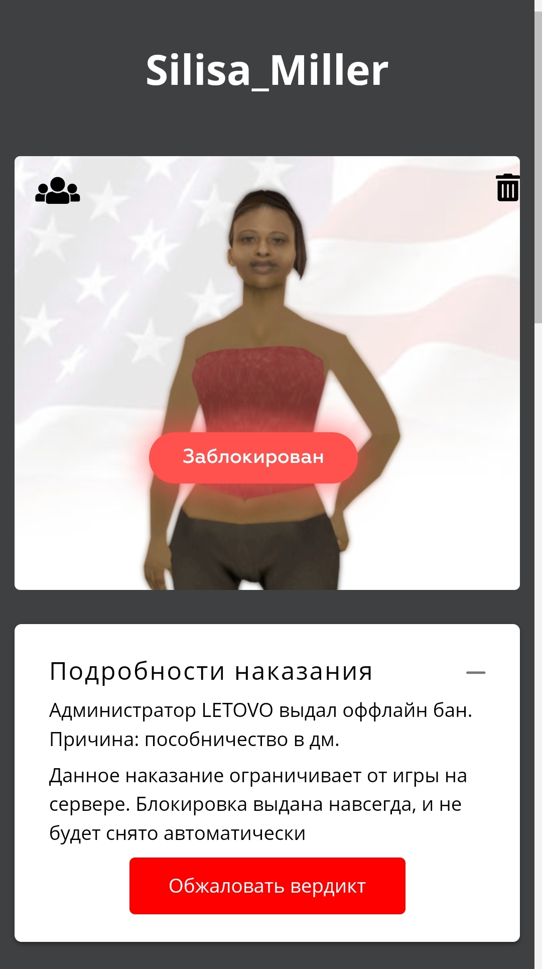 Суть жалобы: Забанили за пособничество в дм, ситу откатили, всех разбанили а меня нет.
