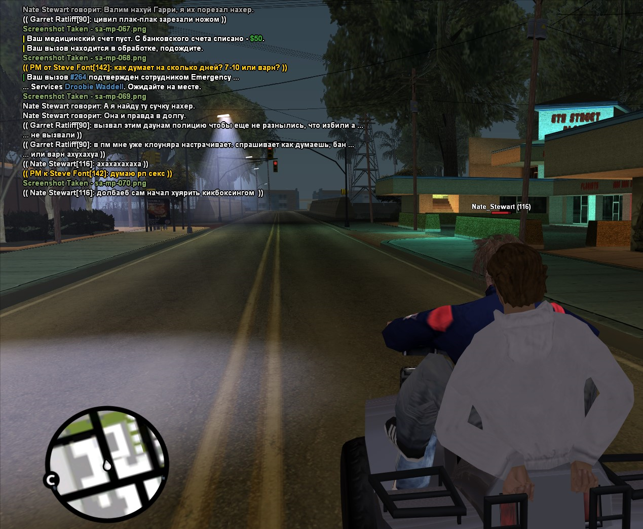 Суть жалобы: Хотели ограбить девчонку, она начала кричать и мой перс испугался и сказал иц корешу "Бля ладно, пошли от сюда.." Тут приезжают эти "чип и дейл" из неоткуда влазят в чужую ситу и начинают её расспрашивать "че такое", мы как раз садились в тачку, я пишу в шутку "Она нас грабила, спасите пацаны" сразу как только я это выкинул в чат Gerret_Ratliff вытаскивает меня с машины без отыгровки, хотя мы стояли и экстренной ситы не было и они не могли знать дам я газу или не дам(как они придумали ниже в коментах), и начинается тех драка тоже без отыгровок от них не разобравшись в сите, ну да ладно, самое интересно, что Nate_Stewart достает нож в обычной драке 2 на 2 убивает нас двоих, что угрожало его жизни в драке которую они сами создали я так и не понял, так как они играют обычных цивильных - могли бы копов вызвать к примеру или припугнуть, но никак не убивать сходу просто так, неролевое поведение и дм с их стороны