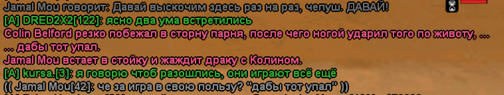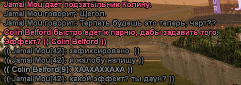 Дело в том что он вообще меня дмил, когда я просто ехал по грув-стрит, потом когда Админ написал в нон рп чат, тип сразу написал в ic чат "Придурок", очень тупо делать такое, потом вновь откинул в стадию. По поводу "Игра в свою пользу" мой персонаж ударил того в живот, но-но, мой персонаж хотел что бы он упал, я не играл за него, а просто не правильно сформировал отыгровку.