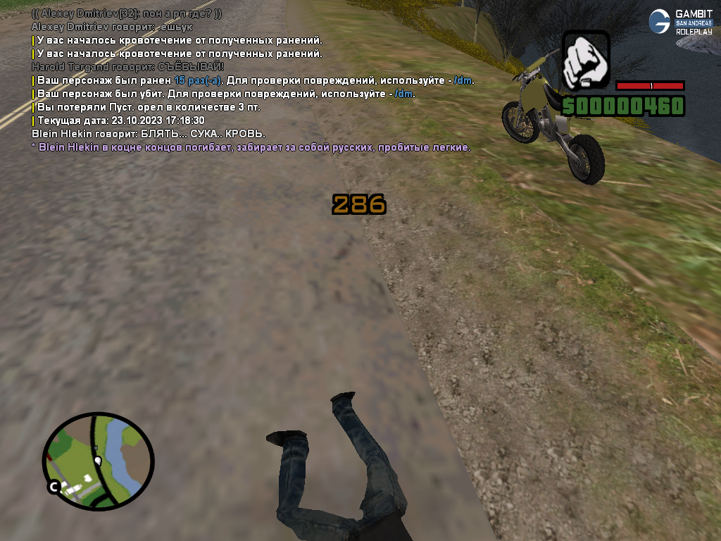 да, к слову, я являюсь нестандартной ролью, вы начали за мной пресследование, целились, я заныкался за мотоциклом, вы начали меня чуть не давить, пока вылазили - я вас расшатал, Дмитрий вообще живой.