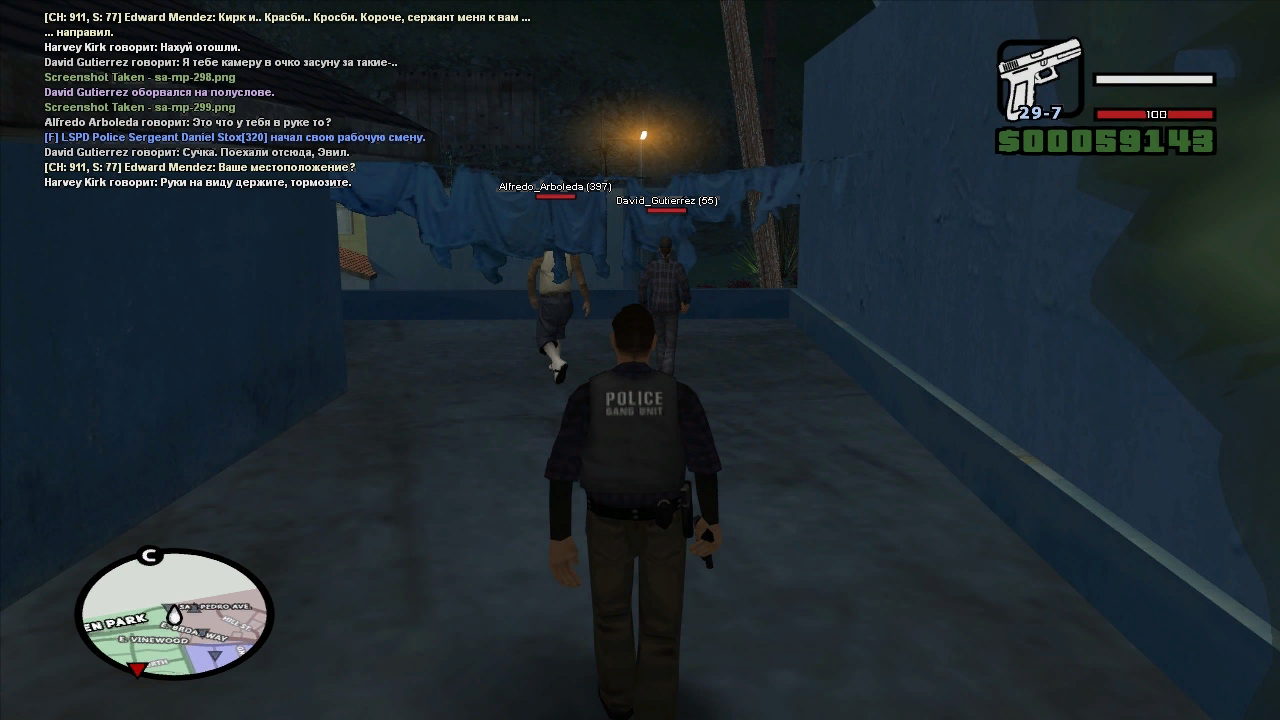 в ходе преследования, полицейский Harvey_Kirk, имея при себе систему *повалить на пол* не решается ее использовать, когда уже бежит за тобой в притык. Он решает пожалеть крайм и начать с ним НОРМАЛЬНОЕ взаимодействие, а не COPS AND ROBBERS, он решает просто ударить игрока, мол он его догоняет и буквально может быть берет за одежду, роняет и в том духе. Что же делает наш подозреваемый? переходит на оружие, ладно, я упущу момент, что его роль уже тут ни к месту, а просто приложу скриншот и объясню: