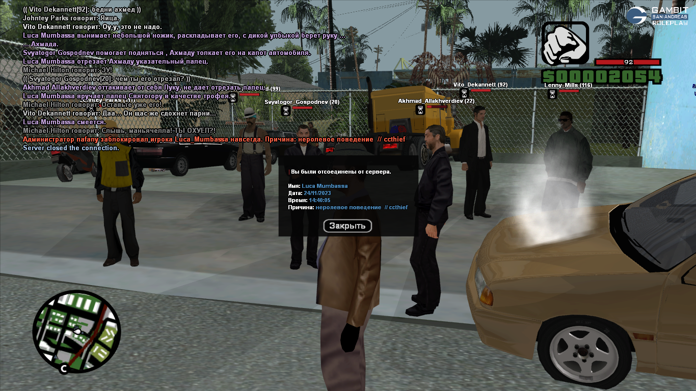 Суть жалобы: Я че то не понял за что меня заблокировали. В общем мы с нацонал-социолистом избили Ахмеда за то что тот гнал на этого Святогора, потом мы решили себе оставить трофей именно по этому я решил отрезать конечность на руке этому лицу кавказской национальности. Суть в том что мой персонаж с богатой историей и практически 5 лет я за него играю на этом сервере, старая и более мне уважаема администрация в курсе того, кем числится мой персонаж по этому я хочу что бы меня разбанили немедленно. То что у вас там квенты слетают в профиле персонажа это не проблемы, так бы могли прочитать полностью описание моего персонажа. На скриншоте каких то неролевых отыгровок нет, либо же администратора ко мне на ковер, будем разбираться.
