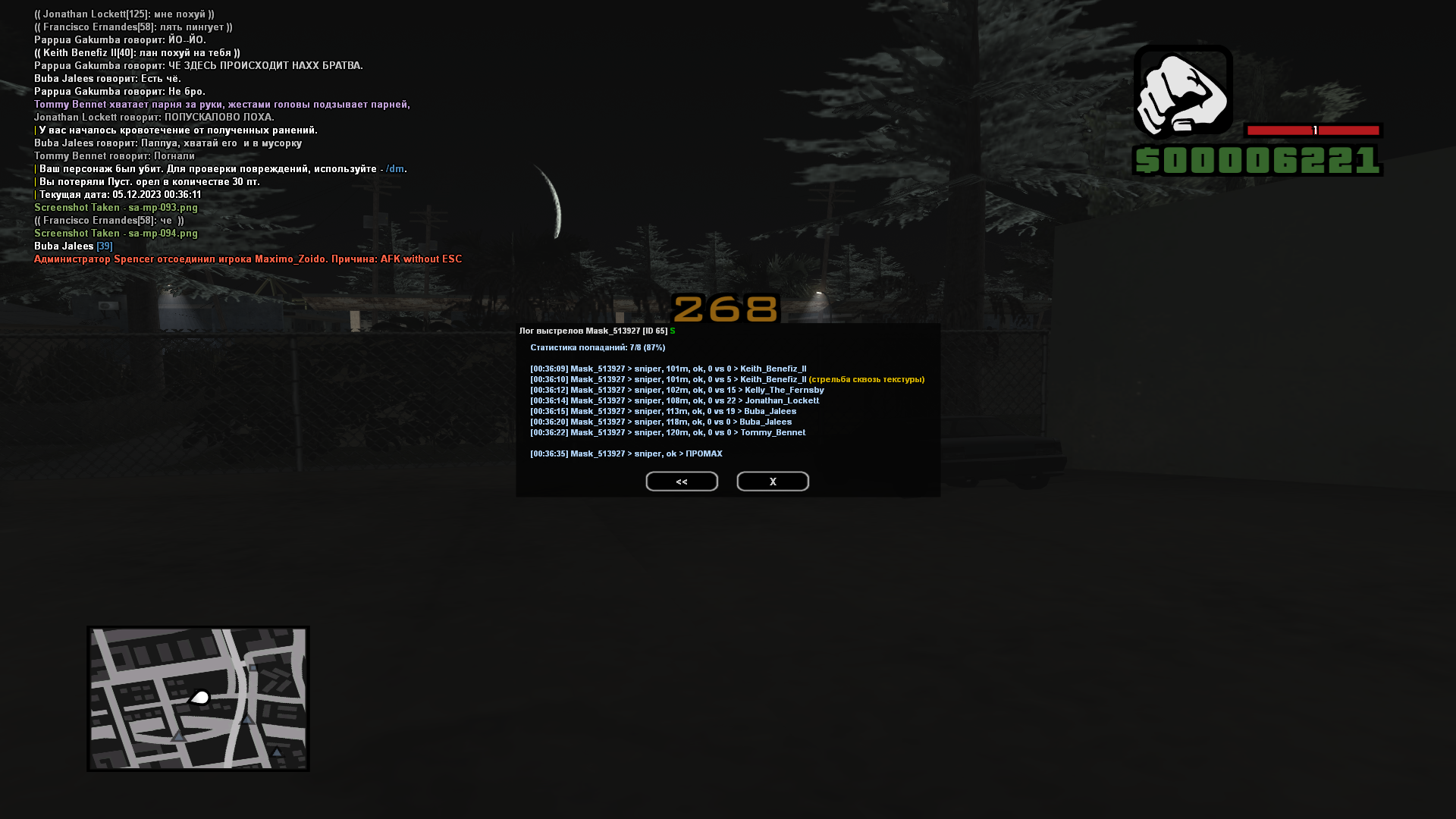 Суть жалобы: Ограбил этого типа находясь в маске, забрал у него 170к. Примерно через час стою без маски на бутылках и с расстояния 120 метров он открывает огонь по мне из снайперской винтовки. Как он понял, что там стоим именно мы и тем более как он понял, что там стою я, так-как грабил я его в маске и стоял на расстоянии 120 метров, что не давало ему увидеть даже мой ник и id. Стрелял без промаха, дал 7/7 с снайперской винтовке по мне и остальным, кто находился рядом, учитвайте, что остальные сразу побежали в рассыпную и я погиб первым. Стрелял он в маске, узнал я его никнейм, так-как мониторил таб пока он ее снимет.