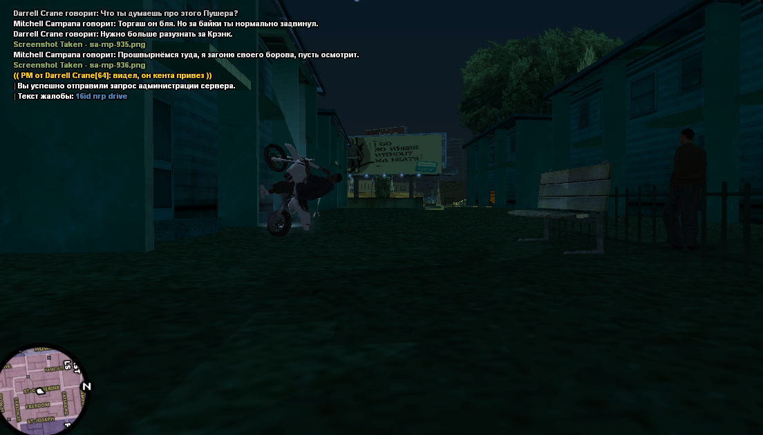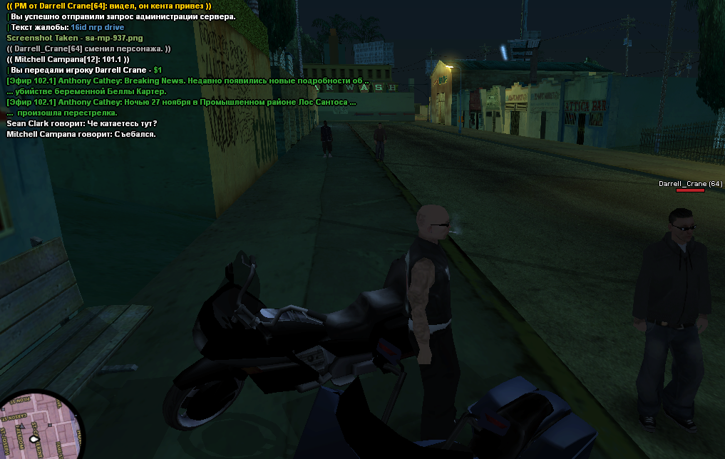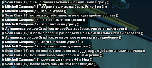 Суть жалобы: Стояли с корешем вели светскую беседу. Подъезжает Шон Кларк, таранит байки и моего кореша и уезжает. Мы остались там же, продолжаем базарить, тут снова он подбегает, начинает доёбы кидать, мы его прогоняем. Подходит его кореш, начинает провокацию, пока мы ведём драку 2 на 2, Кларк отбегает, достаёт ствол и расстреливает нас.