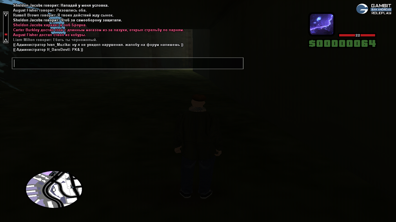 Суть жалобы: суть такая, мы ехали с другом и чел врезались в нас , мы вышли начали разбираться входе игры, моему персу не понравилось как разговаривает август и мой перс плюнул ему в лоб на что недошотеры подоставали свои пукалки и начали ложить просто всех кто там был. считаю что если я харкаую в лоб парня это не причина убийства , думаю что надо хотя бы на 10 дней откинуть таких умников у которых оружие появилось за 2.3