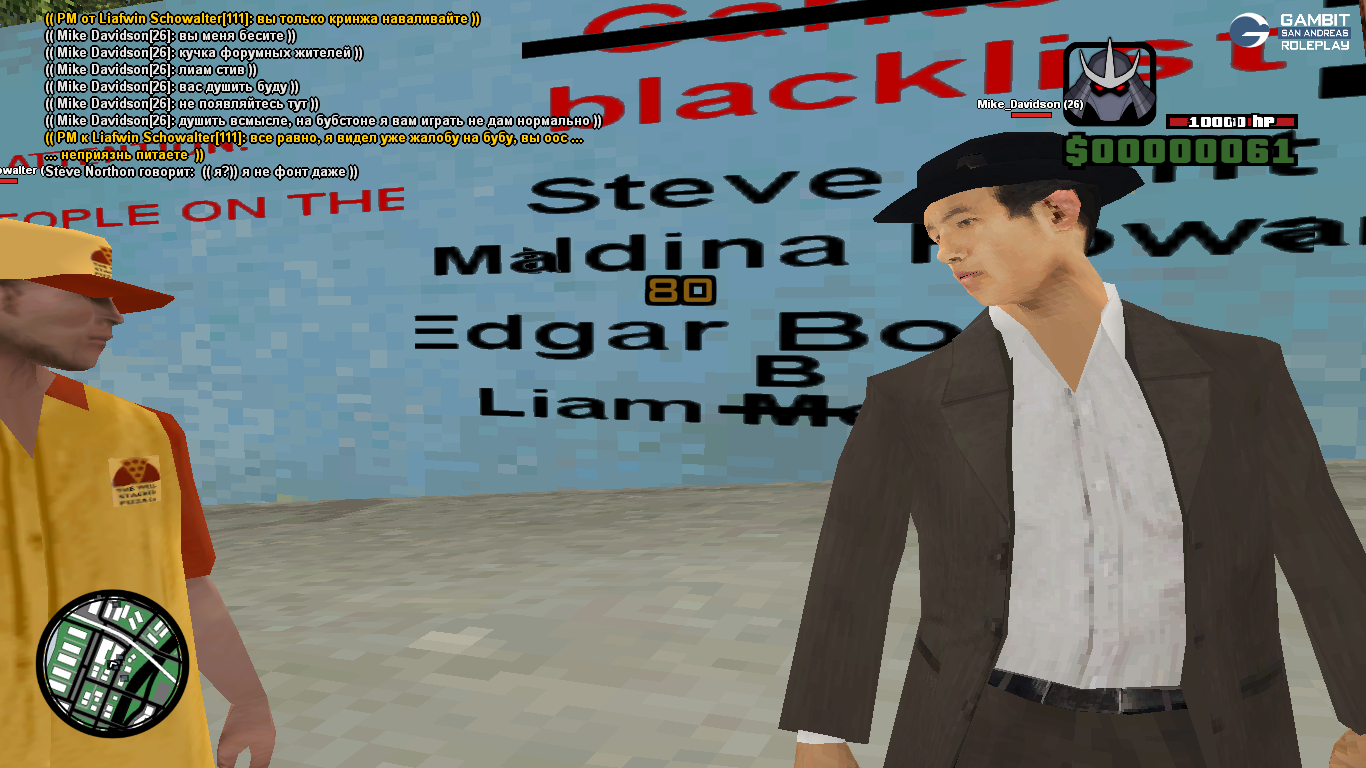 я включаю фрапс, зная что вы будете нарушать при том что я ничего вам по ИС не сделал, вам просто сказали кого нужно проганять, хотя вы по ИС не знаете ни наших имен, ни наших фамилий, ни нашей внешности. Просто даже интересно какой гений написал на стене абсолютно все наши ники сказавши, что это черный список гентона? Вы поймите, что это ООС инфа, вы не можете просто так писать на стенах наши ники и видя нас убивать нас. не зная по ИС наших персонажей