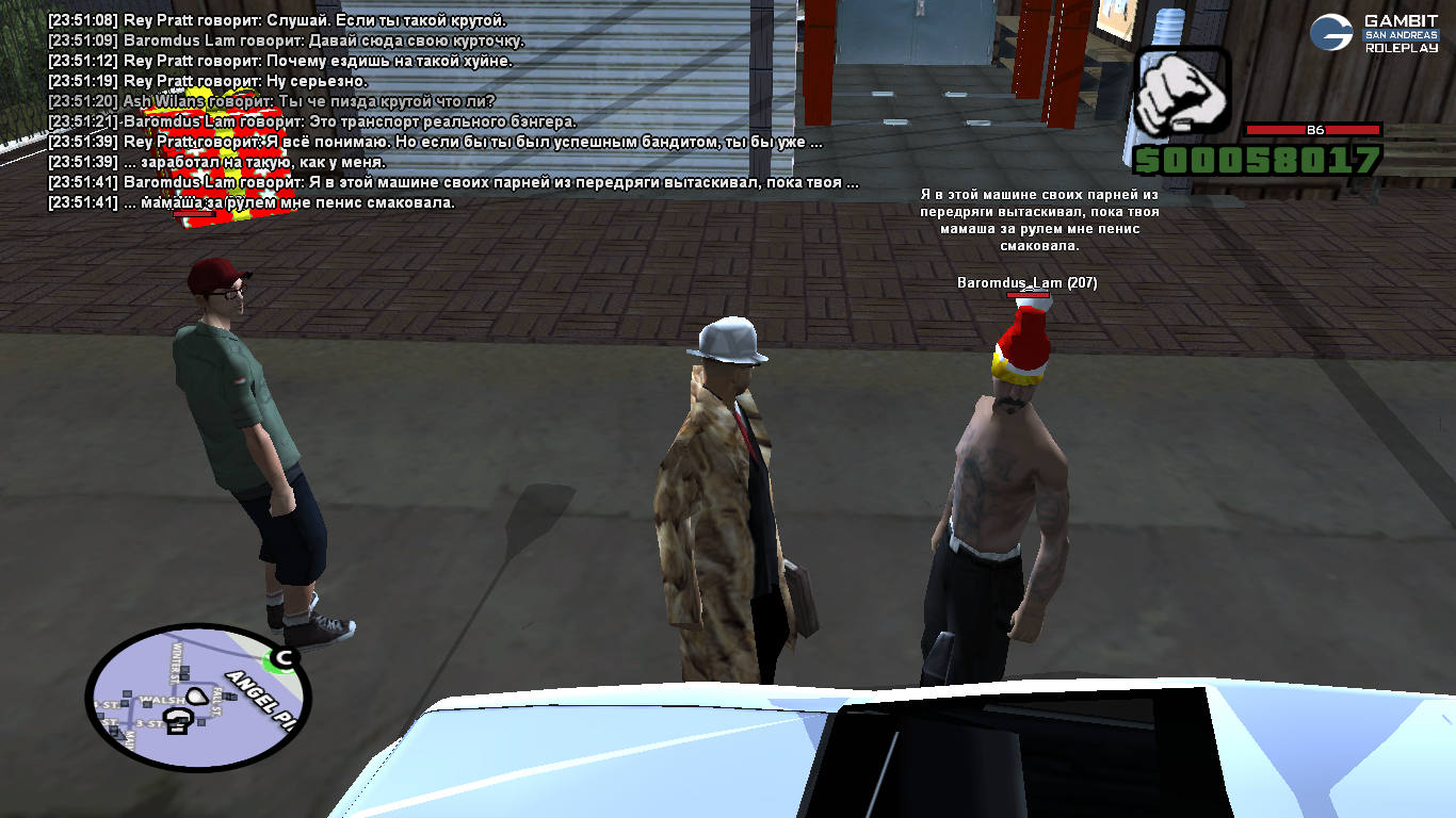 ладно, насчет оос игры у меня нет вопросов, но насчет шота до сих пор остается. я не думаю, что для не особо криминальных личностей убийство из-за ограбления в 25 тысяч - норма, куда легче было просто выкинуть меня из тачки и забрать мои деньги, и те деньги, которые я забрал у твоего персонажа, а не убивать, но видимо че-то не срослось