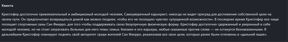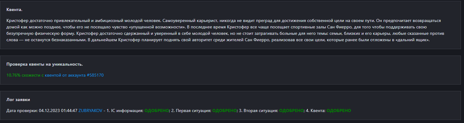 В-пятых, попрошу проверяющего администратора обратить внимание на ЛК персонажа Bobby Lam на предмет нарушения правил проекта. Данные прикреплю скриншотами в хайд.