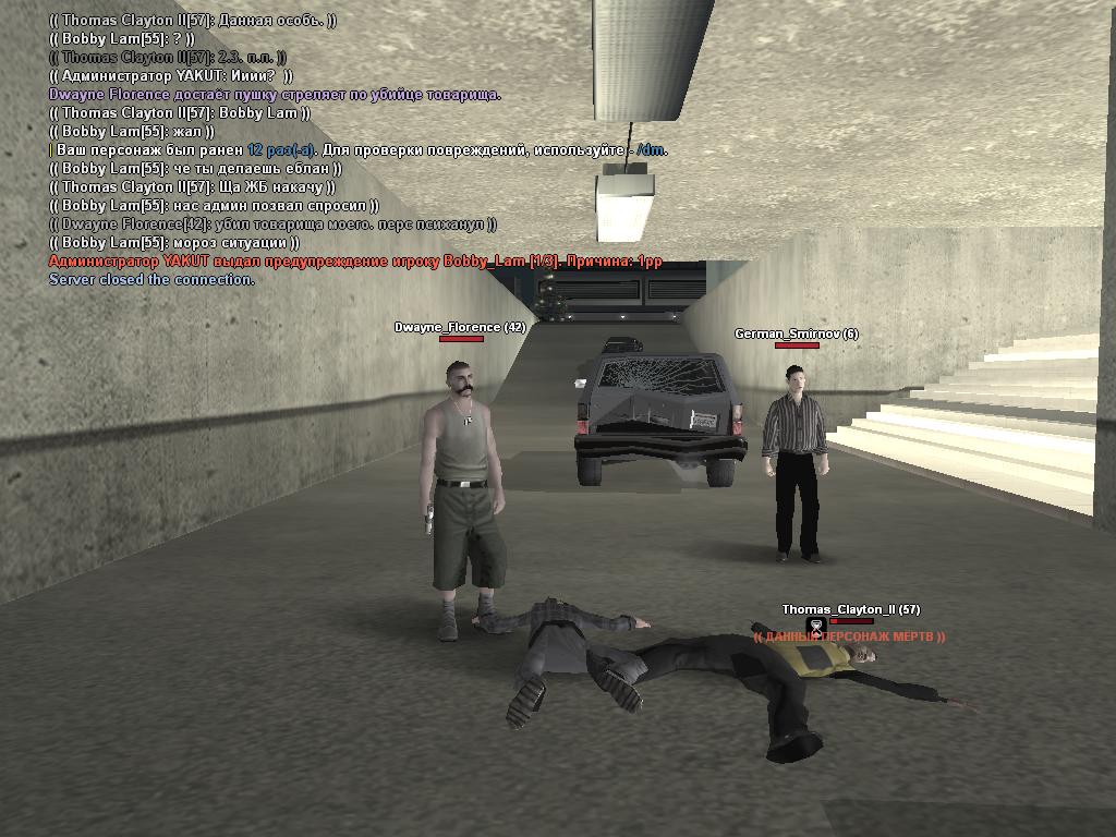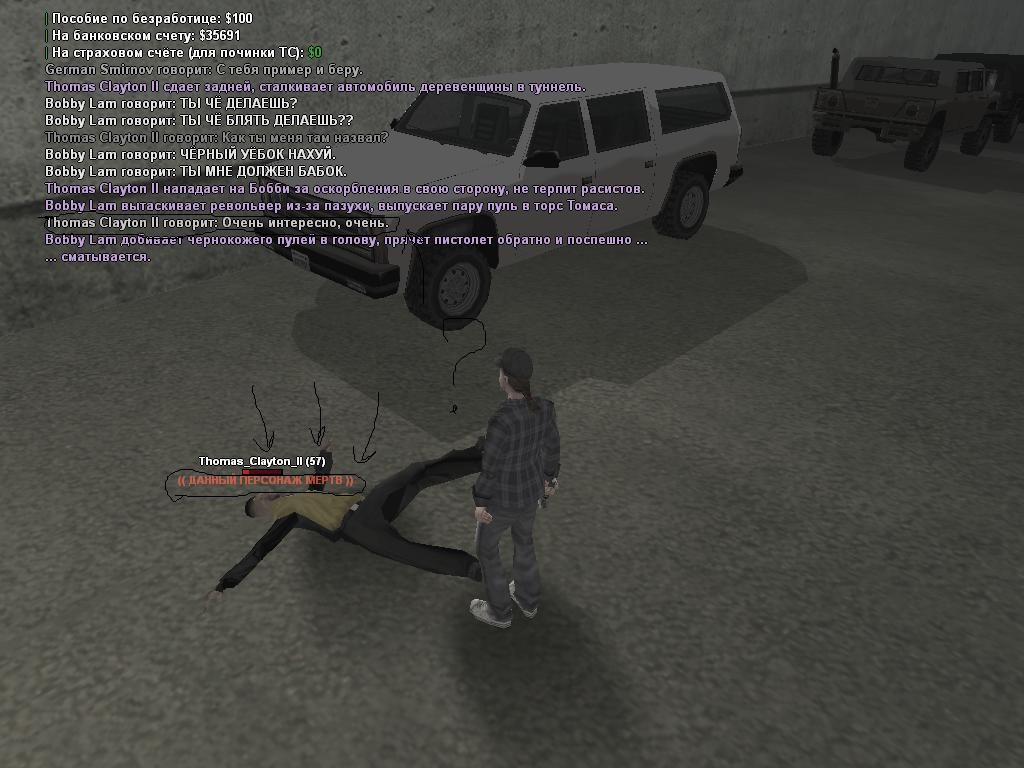 Суть жалобы: Ехали с приятелем по СФ, в нас врезались типы. Завязалась потасовка, в ходе которой мой персонаж начал агрессировать на водителей авто(виновников ДТП), вдруг из ниоткуда появляется Thomas_Clayton_II и начинает отыгрывать что придерживает пистолет, встаёт за свою машину и т.д. - ВООБЩЕ НЕ ПРИЧАСТНЫЙ К АВАРИИ ЧЕЛОВЕК ПРОЕЗЖАЮЩИЙ МИМО. Далее, парень рядом отыгрывает что достаёт кастет и держит тот в руке, мой персонаж начинает опасаться и говорит чтобы тот его убрал. Этот Томас отыгрывает что спихивает нашу машину в тоннель на своей машине, я бегу за ним говорю мол чё ты делаешь, чё за хуйню ты творишь?? Он обьясняет это тем, что я назвал его //чёрным//, говорит что ненавидит расистов и в этом же тоннеле налетает на меня с кулаками. Мой персонаж испуганный кастетом, поведением самого Томаса, как тот стоял за машиной с пистолетом, как протаранил машину в тоннель и набросился на моего персонажа - Бобби с кулаками в этом опасном свиду местечке не остаётся ничего кроме как открыть огонь, учитывая что неподалёку стоят его друзья с КАСТЕТОМ, и ещё один парень - Dwayne , отыгрывающий что придерживается за кобуру. Ситуация опасная, и весьма таки можно понять почему я открыл стрельбу по этому парню. Далее данный Томас вызывает админов, мы собирались с моим другом уезжать с места и меня телепортирует к Томасу, тут подбегает Дуэйн и в момент МОРОЗА СИТУАЦИИ расстреливает моего персонажа, я пишу мол зачем ты так делаешь, и случайно обраняю бранное слово, конкретно слово - "еблан"// Тут же администратор YAKUT выдаёт мне варн за 1ПП. К Администратору я никаких притензий не имею, может не разобрался в ситуации или что-то вроде того, но нужно быть всё же как-то попроще, и не выдавать за единичное оскорбление в /b чате варн. Думаю, меня можно понять. Спасибо.