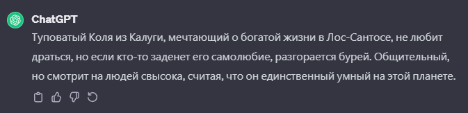 Коля, обычный русский парень, живший в городе Калуга. Ему нравилась родина, но из-за всяких проблем с законами он решил улететь в Америку, надеясь, что всё станет хорошо. Коля не любит драться, но если его разозлить или задеть, что сделать довольно таки сложно, то он начнёт драться так сильно, что всем мало не покажется. Он очень общительный, любит вечно трепаться с друганами по мобиле, затем гулять на улице и танцевать у себя дома под музыку. Часто зависает в гостях у друзей, иногда пробует что-то новое, даже если это запрещённое. Боится умереть, так и не став богатым или известным, хочет уйти из жизни как можно позже и грациозно. Мыслит шаблонами, думает, что все вокруг дебилы, а он единственный и неповторимый, поэтому относится к людям как к животным, разговаривает грубо и прямолинейно. Хочет стать богатым и успешным, мечтает жить на богатой горе Лос-Сантоса, покуривая травку, наблюдая за людьми, которые каждое утро бегут на работу, но пока он только ищет себя, не знает, кем работать и как заработать. Любит своих родных и друзей, не обижает животных, часто наблюдает за природой.