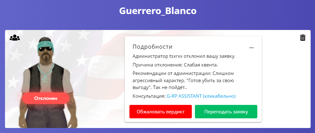 Суть жалобы: Погодите, что значит "так не пойдёт"??? В этом и смысл квенты что бы описать характер, что значит "Сильно агрессивный", а нахера мне тогда квента если я не могу написать то что я хочу и то, кого я хочу играть???? Мне писать милого паинька? Бред какой то админ, ни разу мне НИКТО не отклонял квенту, из за изобильной жестокости.