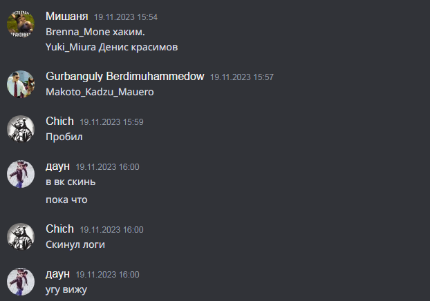 Суть жалобы: Рассписываю подробную жалобу на данных двух людей. Разборки будут долгие и мучительные, но раз уж они сами не лучшие игроки ГРП и мешают людям спокойно играть. Начинаем рассказ. Дело начинается с первоначального момента это дискорд, тогда я играл на гамбите месяца два от силы и когда данные игроки просто стали токсичить, меня тогда было легко вывести на эмоции чем щас. Они оскорбляли меня в дискорде, там же состоит НОЯБРЬ ваш хелперочек - ангел и цветок жизни, который также учавствовал в данном беспределе. Используя OOC инфу полученную с источников других, они использовали в рамках чтобы наказать меня. А после этого произошла такая ситуация что они начали угрожать кинуть меня в ЧС гамбита, пошли заново в дискорд? Что с этого вышло, они позвали каких-то типо клоунов которые администраторы и шарят там все дела. И данный игрок Brenna_Mone, Yuki_Miura это и есть те самые ребята которые пригласили данных чудиков. Вспомни одно что Brenna_Mone игрок после амнистии и обсудив поддельную сделку, чтобы типо я им поверил что тут коррупция одна, попытались наебать меня. Но эту хуйню я просёк сразу и что получилось? Они доебывались до меня и в игре, по ooc информации, искали только меня и ещё раз меня. Играли полную хуйню, пытались помешать и вызывали копов, чтобы меня арестовывали и прочее.