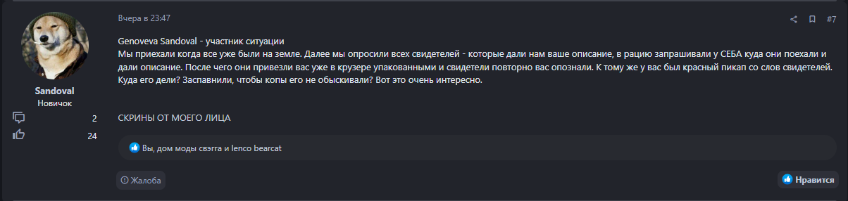 Даже в прошлой жалобе патрульный скинул скрины где вас четко описали, ещё раз повторяю мы вас видели (скриншот выше), поехали сразу к ним ибо там были трупы.