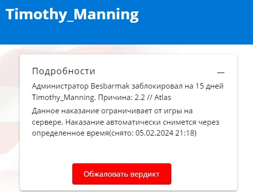 Суть жалобы: Выдал 15 дней блокировки за то что мы на пару с моим товарищем рискнули своей жизнью(wow) и отпинали стрелка с помощью биты и лопаты который напал на нас без отыгровок а в конце и вовсе вышел с игры.