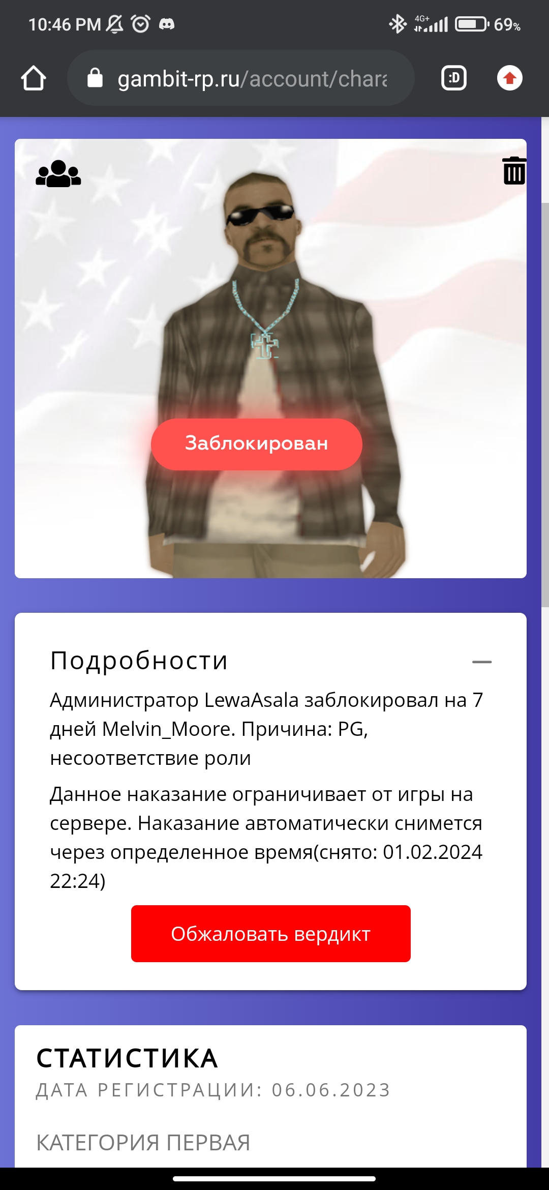 Суть жалобы: забанили на 7 дней за пг и несоответствие роли. распишу ситуацию. катались с товарищем на лоурайдере, что бы не запутаться я мелвин, товарищ финн. к нам подбегает чудик и просит косяк, я пишу что 300 долларов, он передает деньги и я просто уезжаю, все это было айси. потом он со своим другом на джестере подъезжают к кингс, он приставляет револьвер к животу, отыгрывая это. я спокойно отыгрываю то, как затягиваю ситуацию, т.к. это свойственно по квенте (спокойный). затем, приезжает мой друг, и пока обманутый на 300 долларов парень держит моего друга под дулом, за колонной я совершил свидетельский вызов в 911. приезжает 1 офицер на крузере, я отыгрываю то, что бегу за этот крузер и сажусь там. но после чего, наш бесстрашный убийца с револьвером без каких либо отыгровок начинает стрелять. первым он убил меня, а потом, опять же, без каких либо отыгровок он убил офицера, у которого внимание! был в руках карабин. ситуацию по итоу
