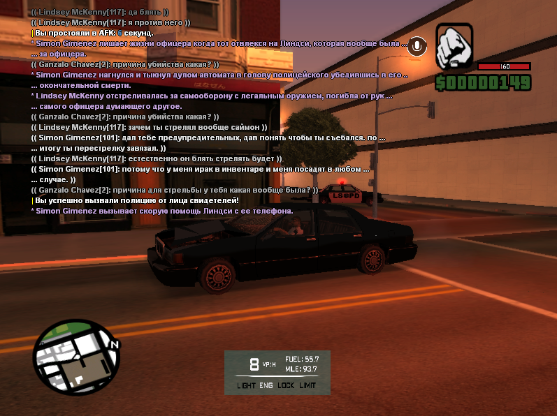 Переходим к ситуации. После недавней перестрелки с полицией персонаж перебрался в другой город для скрытия, по пути забрав путницу в машину для скоротания времени и проведения игры пока он будет в другом городе. По итогу нас останавливает полицейский крузер который не понятно по чему отклонялся, возможен тот случай что мой персонаж был в АПБ после стрельбы, так я и думал на тот момент. Следующим образом, я взял автомат с заднего сиденья ну и в целом обыграл это в ролевом плане, и проехался дальше уже один, когда та которая ехала со мной — покинула автомобиль. Я выхожу на перекрестке и открываю предупредительный огонь по крыше автомобиля, чтобы полицейский уехал и у меня была фора времени уехать из города в округ. Но было поздно и он подъехал в упор, и начал перестреливаться. Честно говоря, убивать я его не хотел. Причина. по которой я начал стрелять, это во первых тот случай, что я его хотел спугнуть полицейского. Во вторых, мой персонаж порядочно отсидел по истории в тюрьме, что до ИС и что в ИС плане. Отыгрывалось большое тюремное заключение в котором провел мой персонаж, по которому я вёл даже топик в скриншотах персонажей.