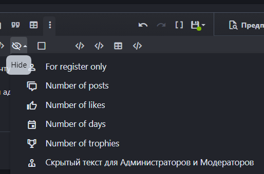 Нажимаешь на три точки, на закрытый глаз, на "Скрытый текст для администраторов и модераторов" и вставляешь туда рег.данные