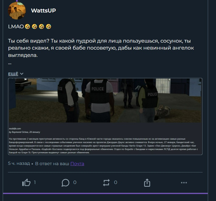 Ну так пусть пишут заявления в пд, это уже игра копам. В чем твоя проблема не понимаю... Ты сейчас переносишь айси моменты в жалобы. Ну поплачешься ты админам, хорошо, но в итоге что? Не проще все это играть дальше? Или дальше продолжит кричать "ааа нам ТРИДЖЫ расстреляли худ ааа"?