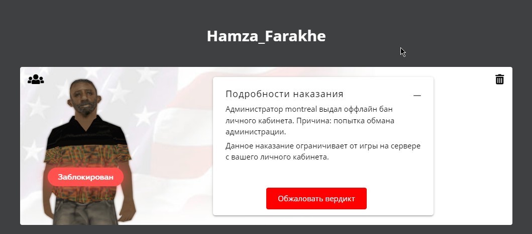 Суть жалобы: Здравствуйте уважаемая техническая администрация. В прошлом месяце я был забанен за софт(сейв аммо) и последующую попытку обмана администрации в жалобе. За время пребывания в бане я успел понять свою ошибку, удалил раз и навсегда этот чит и более не хочу нарушать правила сервера. Также хочу попросить прощения перед администраторами за свой отчаянный поступок. Полученное наказание считаю справедливым, но теперь у меня не осталось аккаунтов для игры, т.к мой ЛК был заблокирован. Надеюсь на добродушие монтрела и возможный разбан аккаунта Hamza_Farakhe. Заранее спасибо!